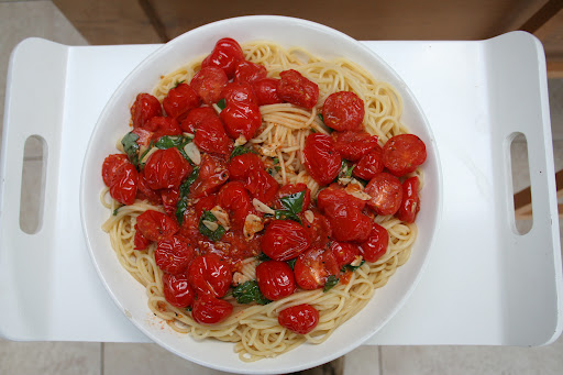 Heat olive oil in a frying pan and add 4 thinly sliced cloves of garlic. Careful it does not burn. Take a good pound of very tasty cherry tomatoes from the grocers and cut them in half and put in the pan with the garlic. You don’t really want them to cook more to heat through so lower the heat a bit. A minute or so before the pasta is ready squeeze in the juice of a lemon into the tomatoes and season with salt and pepper. Drain the pasta, tear some basil into the tomato sauce. Pour the pasta into a large white bowl and slide the sauce on to. Eat with parmesan cheese.