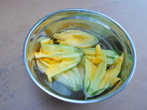 One of the small pleasures of have your own veg plot is being able to grow courgettes and more particularly having the benefit of their flowers. I remember almost 25 years ago seeing them for sale in an Italian Market but that is never going to happen here so you have to grow your own. It is a gardner’s treat to wander to the end of the garden, pick off a flower and eat it. There is something earthy about the flavour, the petals light but rough against the tongue and some bite and crunch in the stamen. Eaten like that there is no point in worrying about what small black insects might be lurking inside but once they are brought into the kitchen it is worth soaking them in a bowl of water for twenty minutes to allow any bugs to escape.