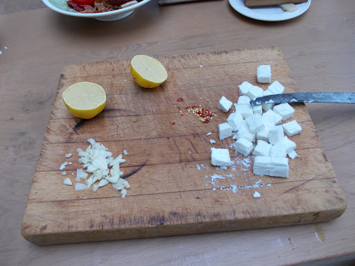 Whilst the courgettes are cooking squash and slice about 5 cloves of garlic and a small red chilli. Stir into the pan with a good seasoning of salt and pepper. Slice the bases of the flowers and some of the petals and add to the pan. This should all be ready in the 10 or so minutes it will take the pasta to cook.