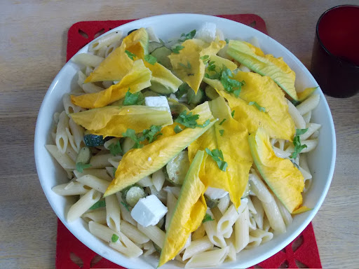 Pour all into a wide serving bowl and slather the top with the last of the courgettes. Decorate with the rest of the courgette flowers and some finely chopped green parsley.