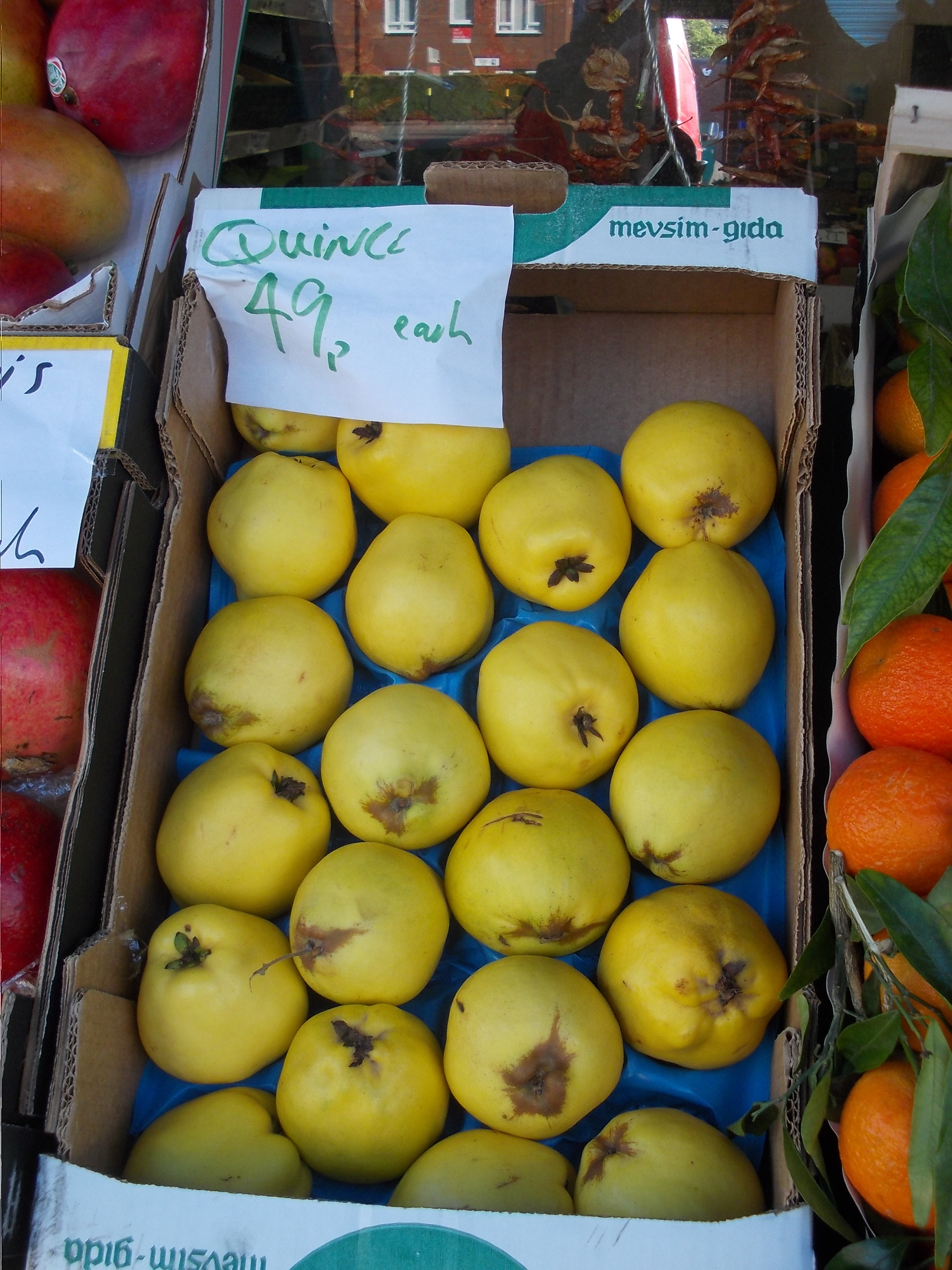 There are quince in the greengrocers on Oxton Road.. I was in there first thing and as I walked out Kazim pointed them out to me. i bought just the one but then as I drove over to The Farmers’s market in New Ferry I convinced myself that one would not be enough and a half dozen or so would look good in the kitchen until I got round to cooking them.
