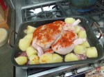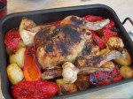 The chicken had been a one pot roast. I par boiled some potatoes and tucked them around the chicken damped it all down with some olive oil and gave it a good dusting of smoked paprika, salt and pepper. It all went into a medium over for about 90 minutes. Halfway through I mixed in two sliced red peppers and three heads of fresh garlic.