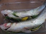 The metal grill was just about big enough to hold them. Before they went on I stuffed them with slices of lemon and fennel.