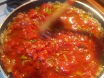 Once the stock was made I boiled the lobsters in sea water for about twenty minutes. I took them out to cool and started work on a tomato sauce; olive oil, another large finely chopped onion, loads of crushed garlic, more chilli and two tins of tomatoes.