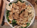 Pieces of chicken were scattered over the spinach leaves, the toasted pitta was crushed and scattered over the chicken and the dressing was smeared liberally over it all.