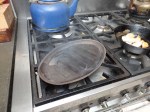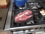 Back inside I put an heavy iron ribbed pan over a high heat to get smoking hot. The steak was cut into three thick strips and salted and peppered. One of the baguettes was cut in half and stuffed with rocket. A drop of oil was swirled round the bottom of the hot pan. Smoke billowed and the strips of steak were laid to spit and sizzle in the pan with the hot oil. I turned them over after a couple of minutes and they were done in five.