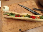 I took the pan off the heat to let them rest for a few minutes more and they were then stuffed into the baguette along with some sliced onions and tomatoes.